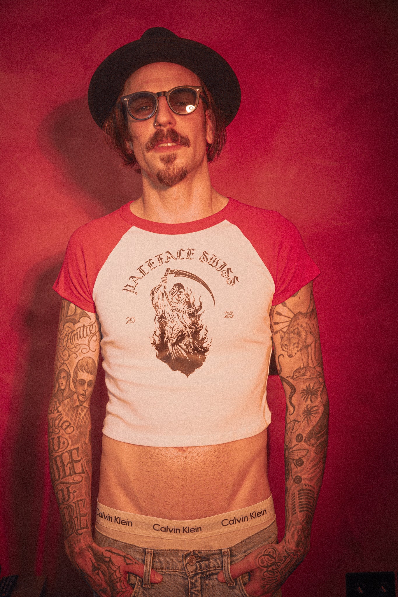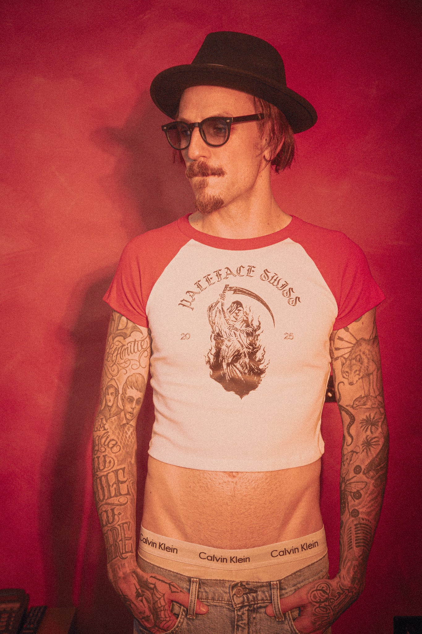 This baseball-style crop top is part of The Wilted collection — featuring the signature Let Me Sleep Reaper artwork.