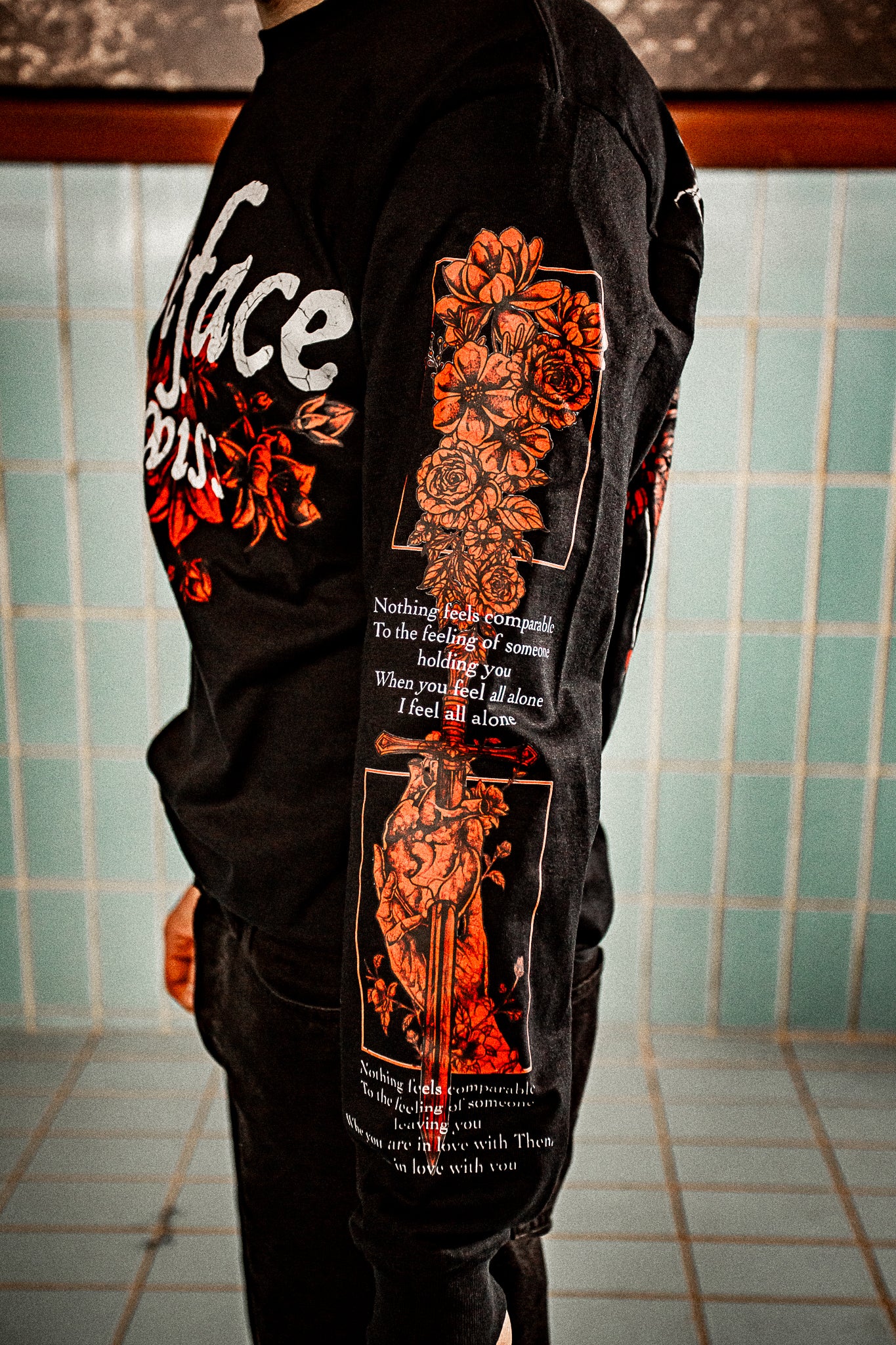 Sleeves: detailed floral and lyric panels for a full‑body statement